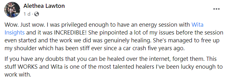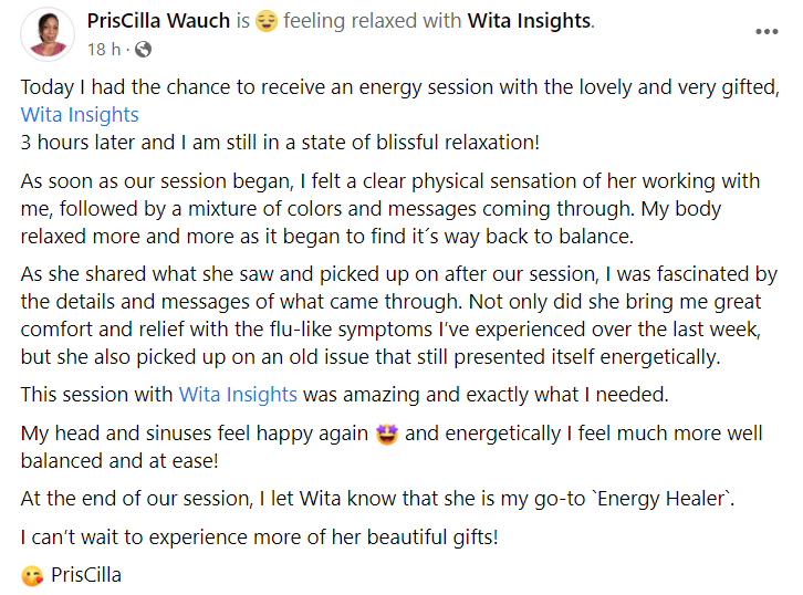 "Wita hat mir schon sehr oft geholfen. Egal, ob es sich um Beschwerden auf seelischer oder körperlicher Ebene gehandelt hat. An einem Sonntag z. B. bin ich aufgewacht und konnte mich nicht bewegen, weil ich sehr starke Schmerzen im Bereiche meines unteren Rückens hatte. Ich schrieb Wita an und sie gab mir sofort eine Norfallsession. Nach bereits einer halben Stunde war ich nahezu wieder beweglich. Mein Freund wunderte sich nur, wie sie das geschafft hat.